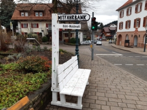 Abbildung: Neusatz Ortsmitte mit der Mitfahrerbank, dem Ortswappen und der Bücherzelle